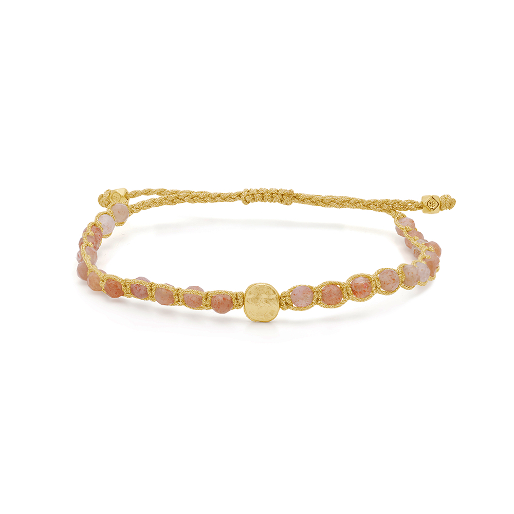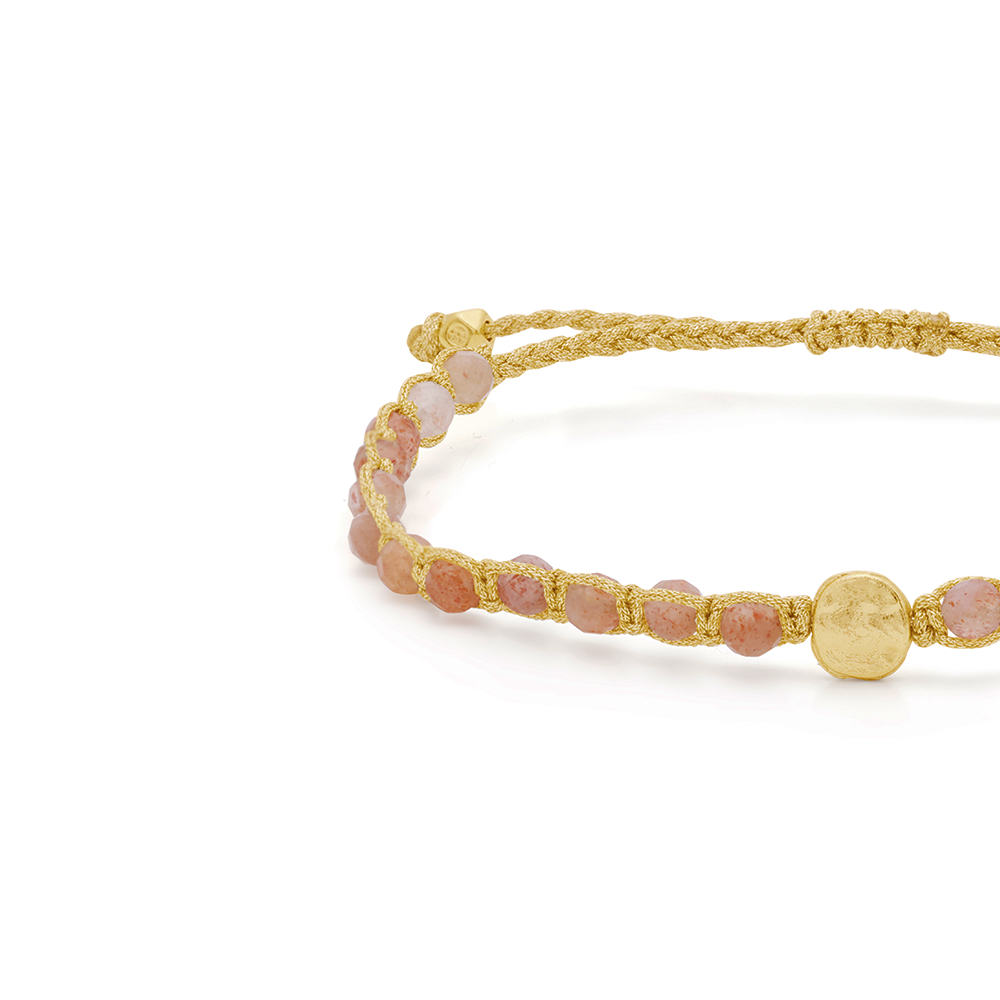 El işçiliğiyle hazırlanan bu özel bileklik, Kuvars ailesine ait olan AA kalite Güneş Taşı ile örülmüştür. Bu taş, kişinin hayat enerjisini tazeler, bitkinlikten arındırır ve içsel ışığı tekrar canlandırır.
